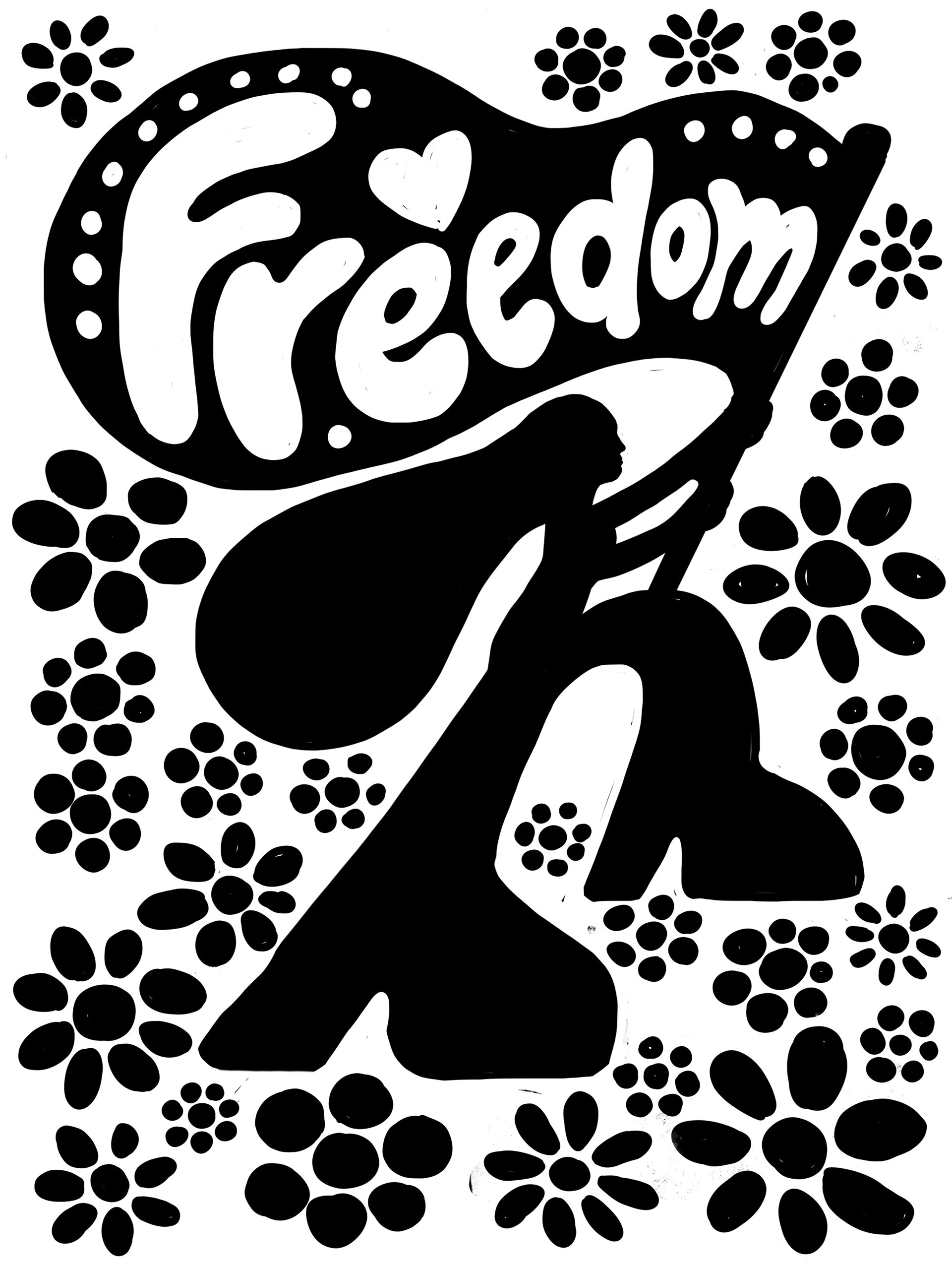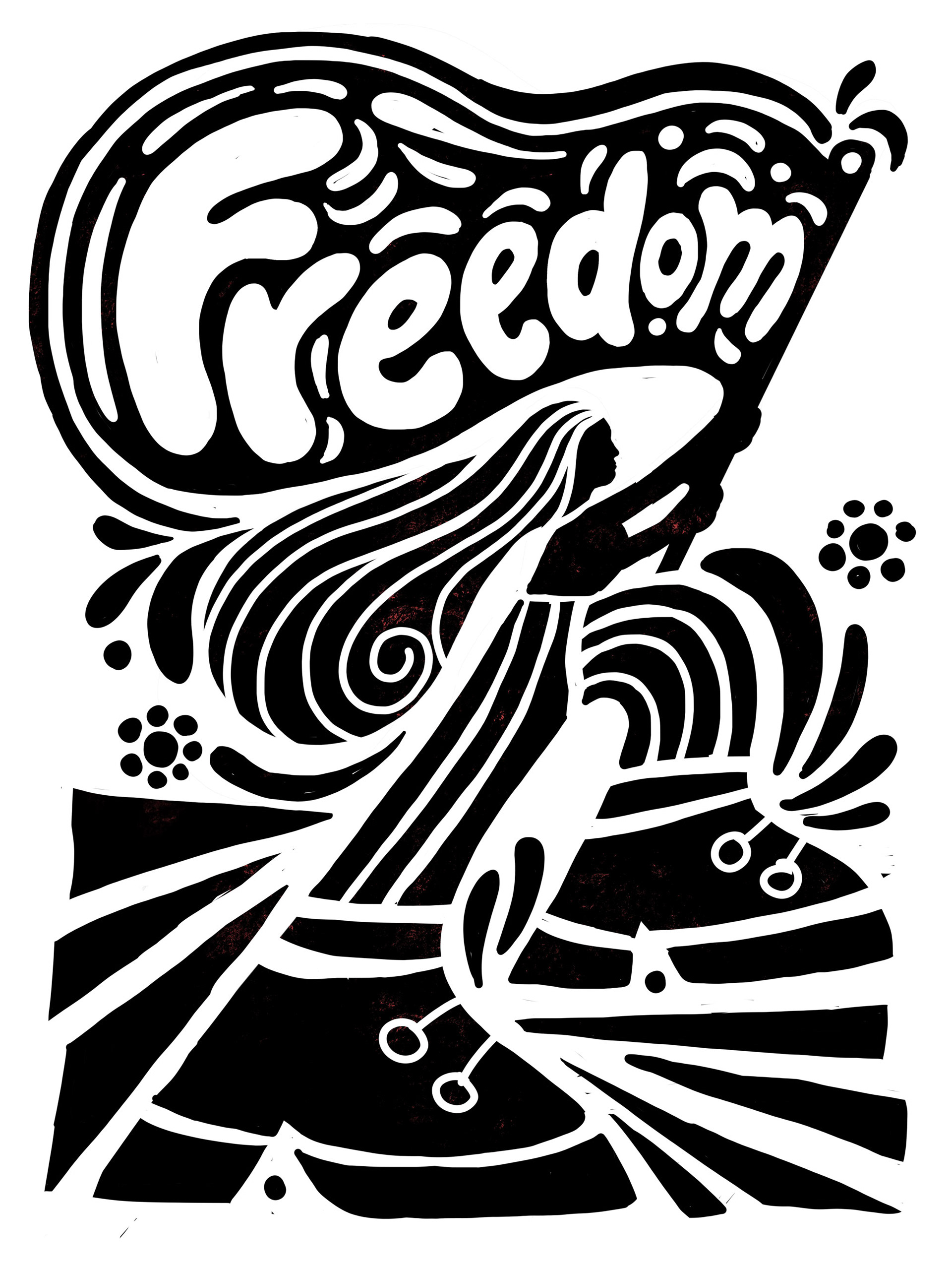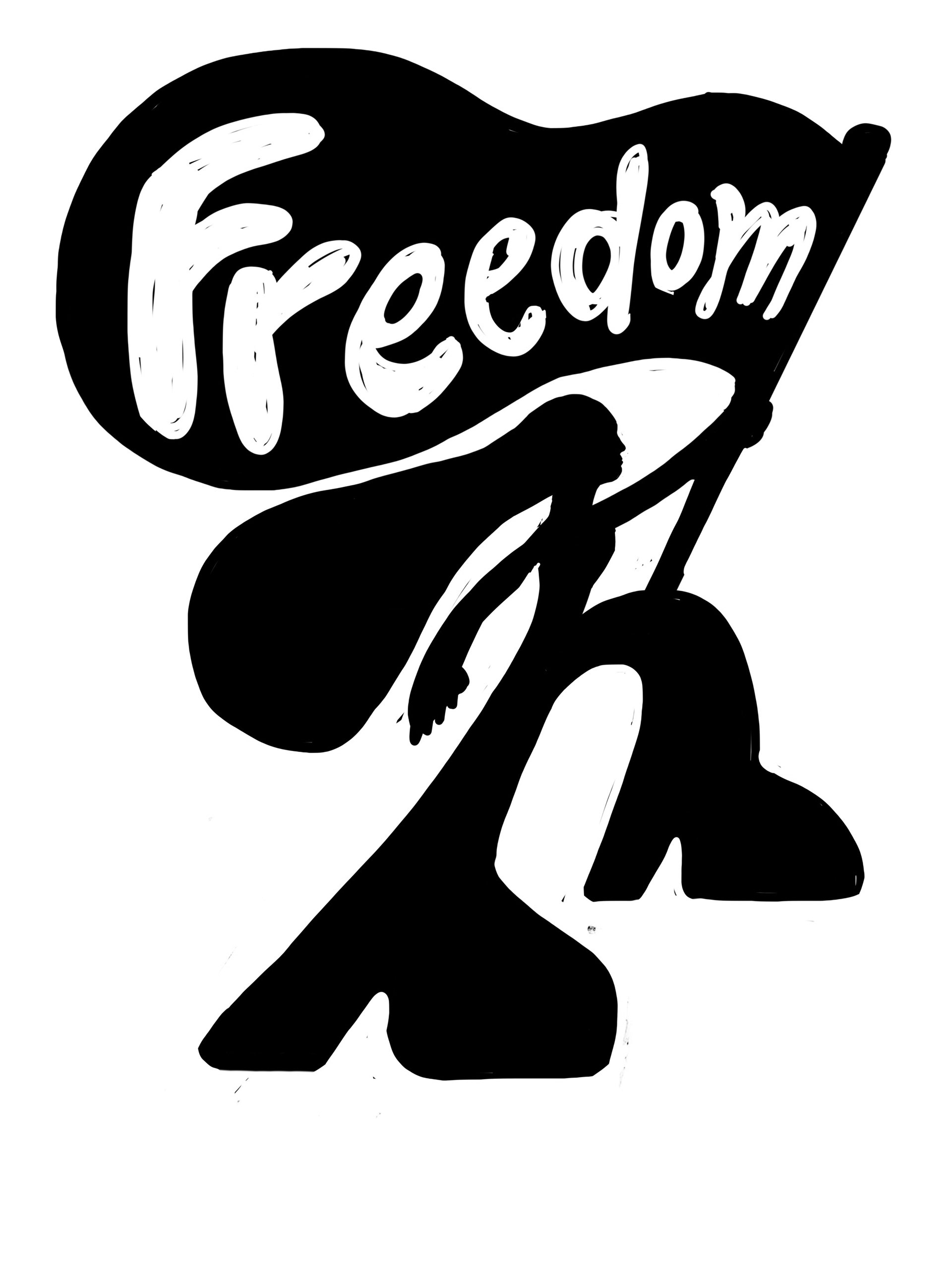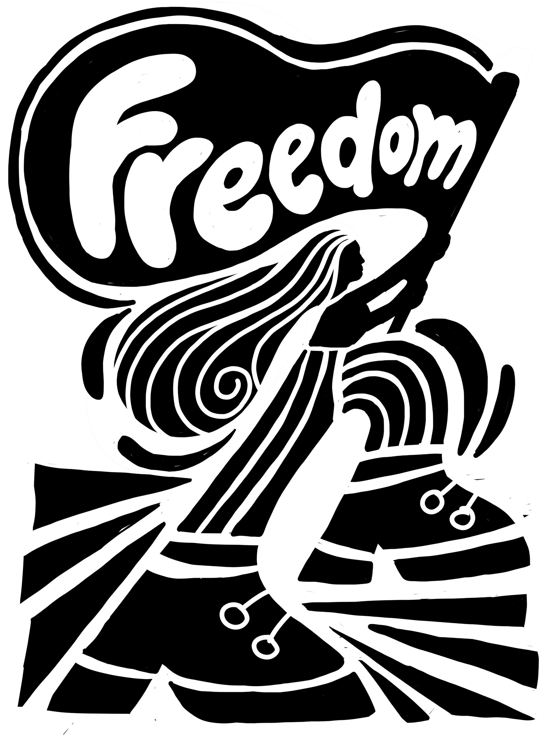 Bold illustration of women marching with flag with the word Freedom to promote Women's Civil rights.