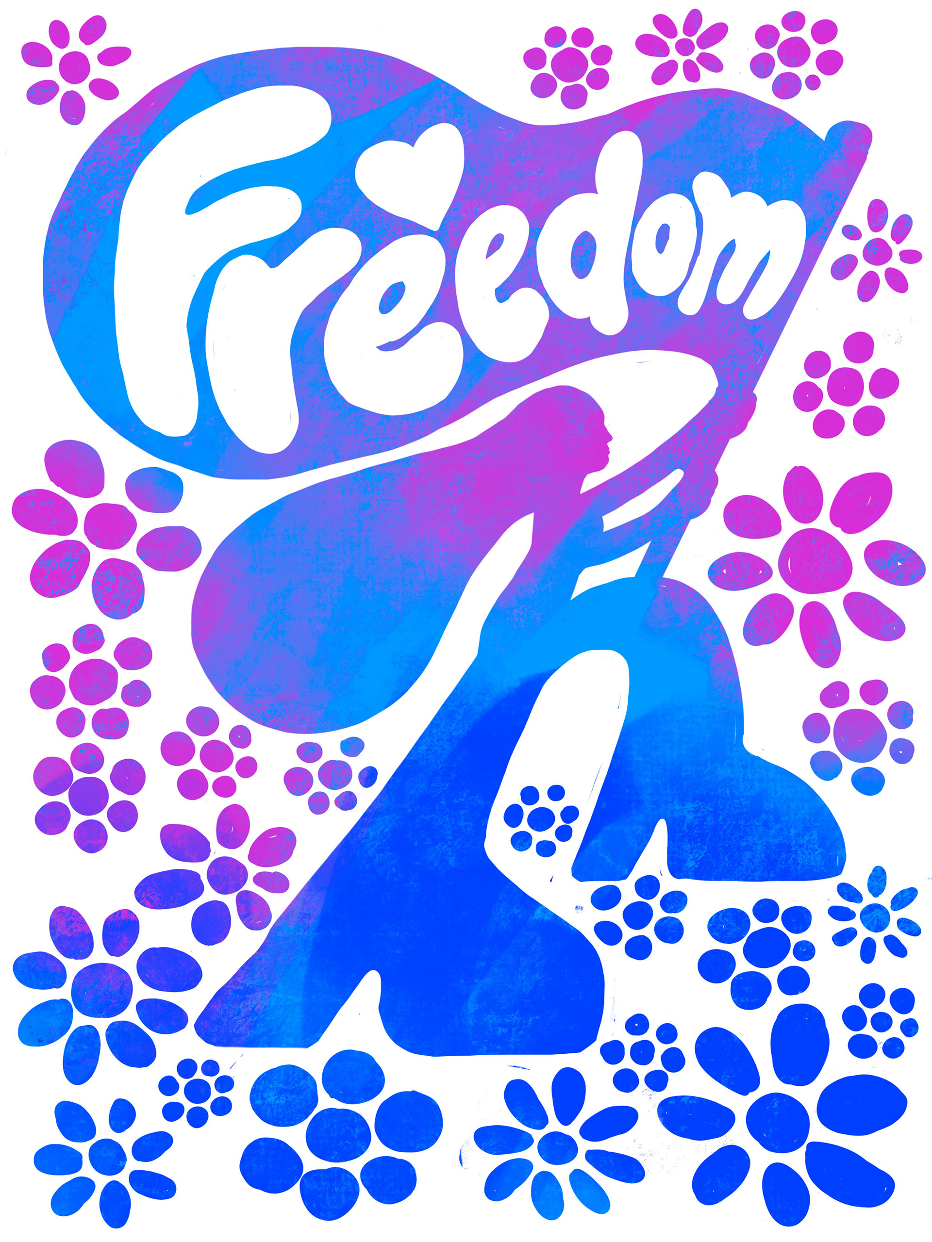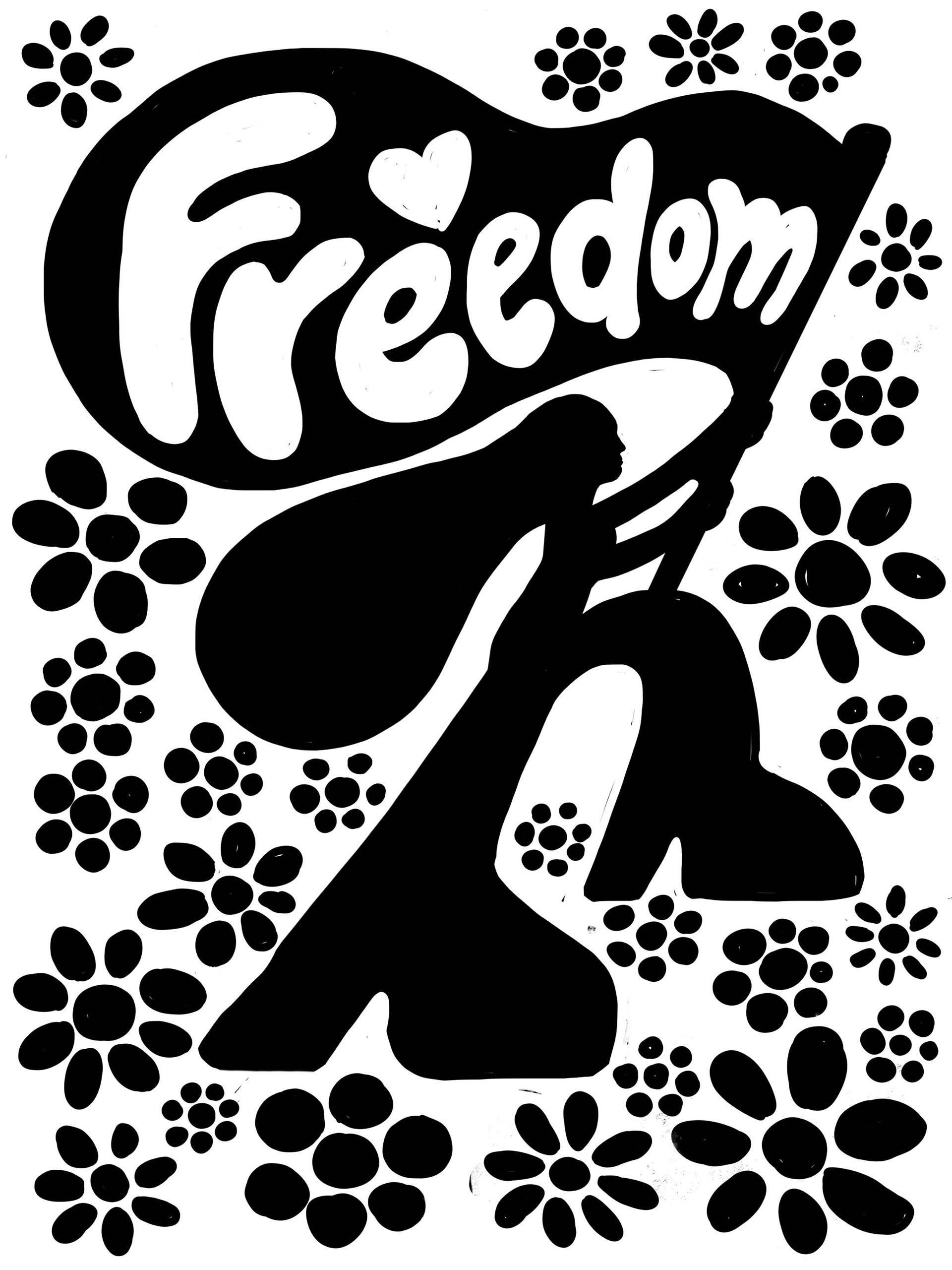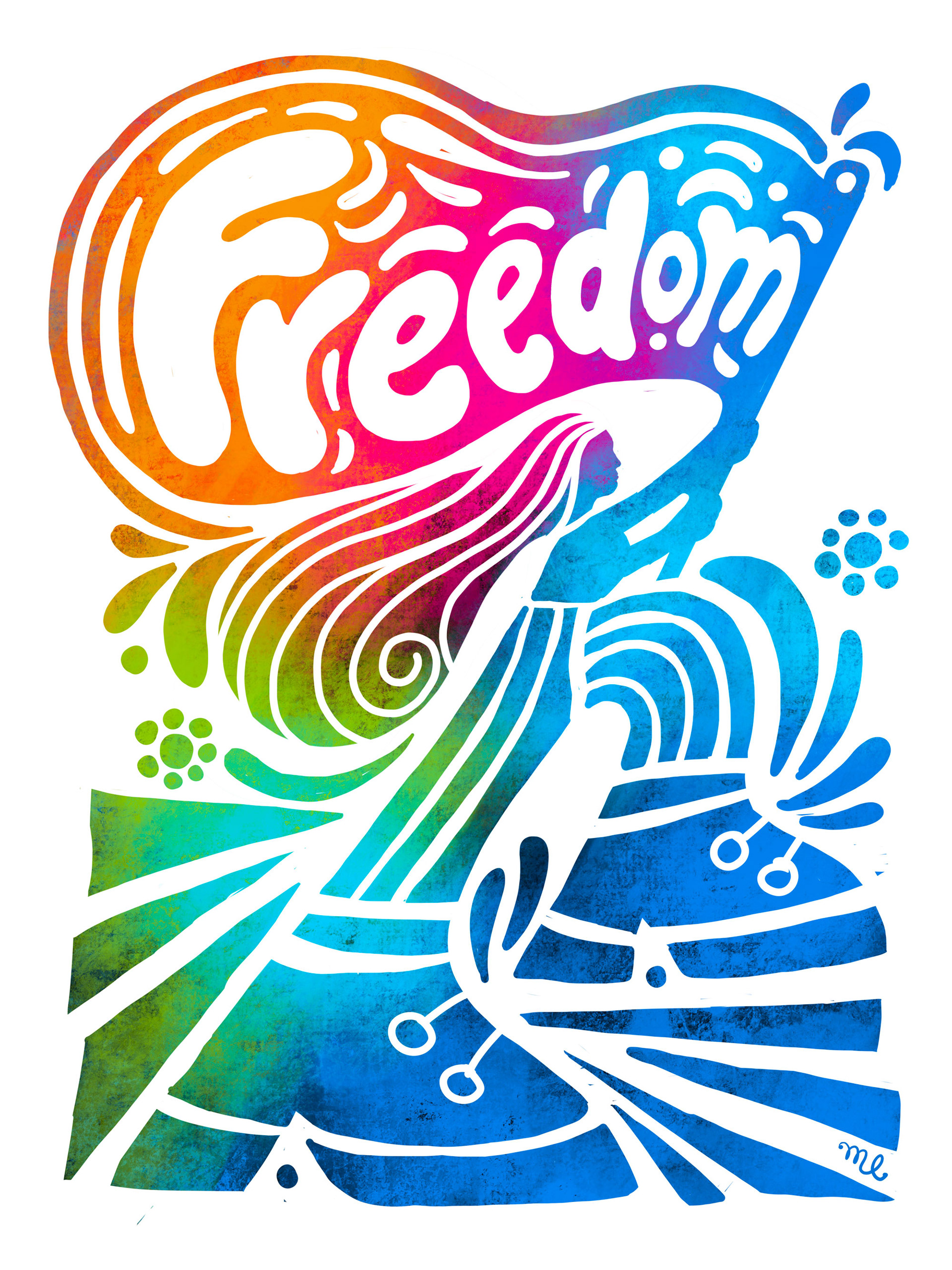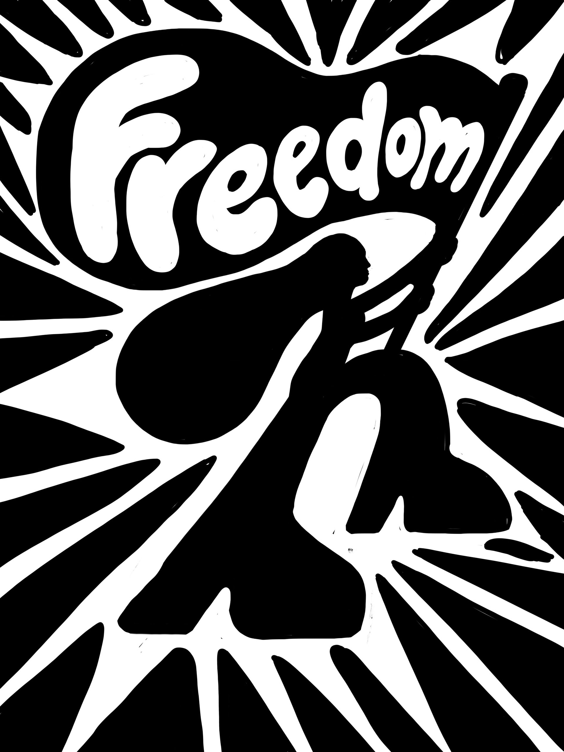 Bold illustration of women marching with flag with the word Freedom to promote Women's Civil rights.