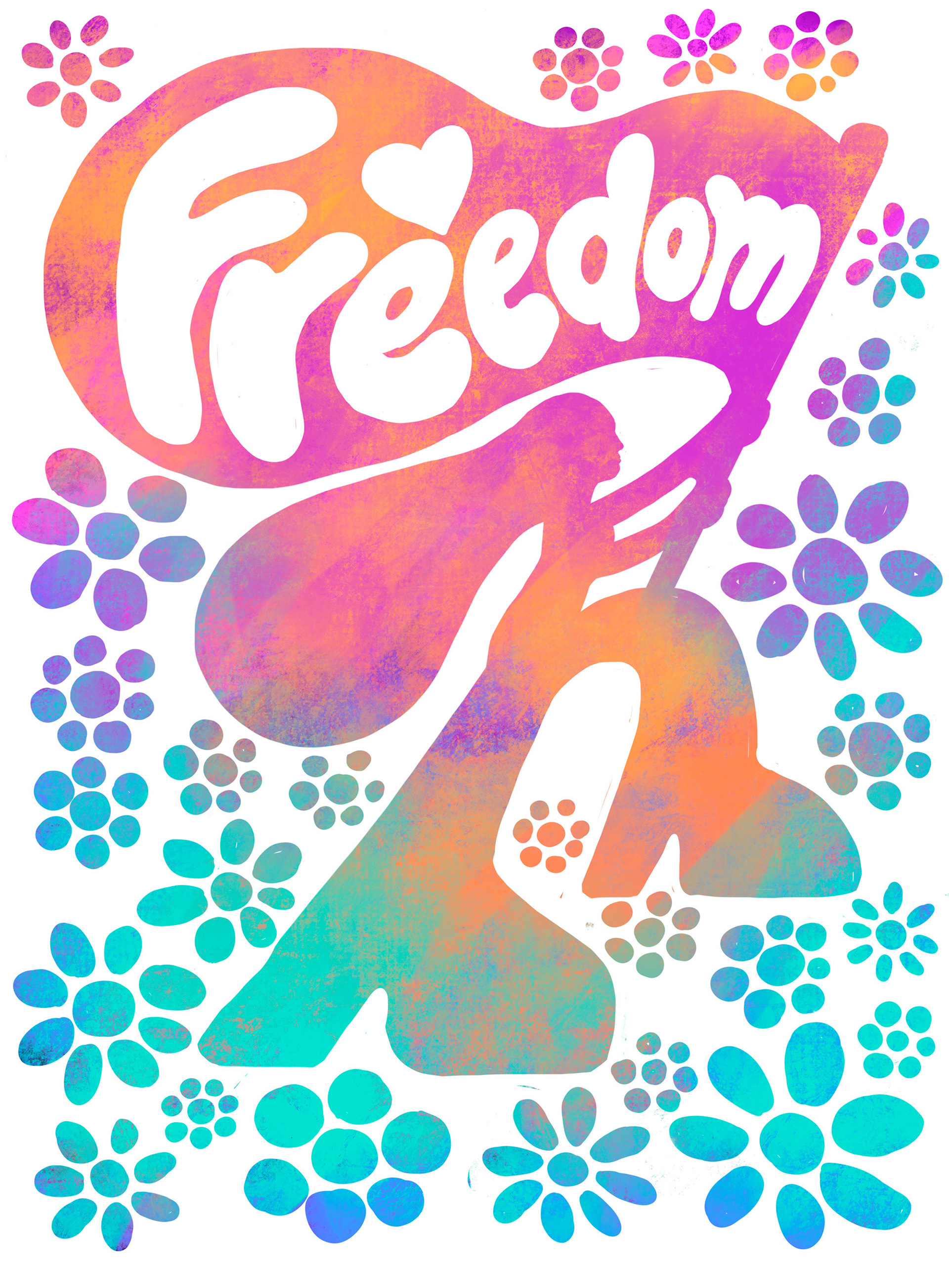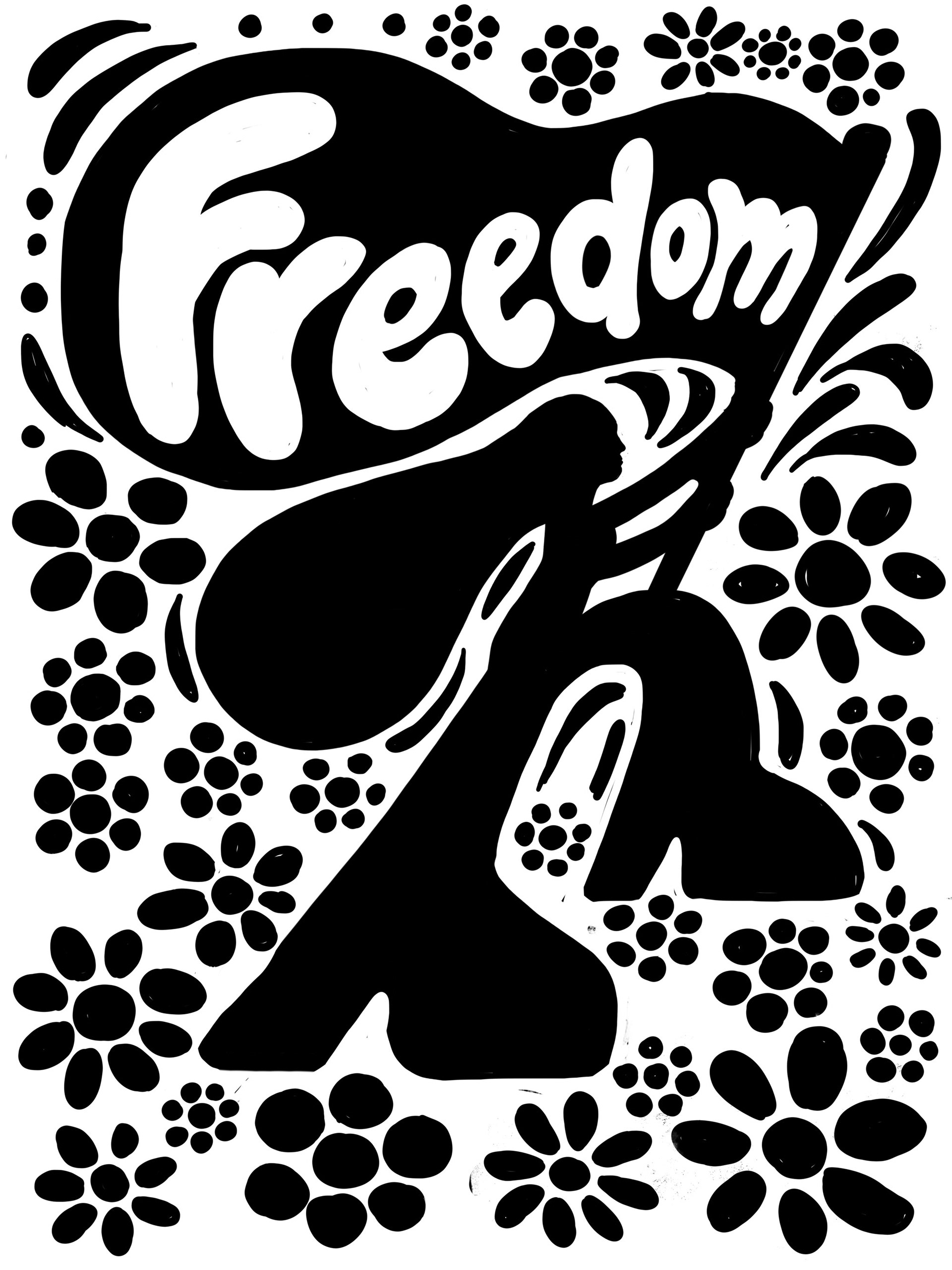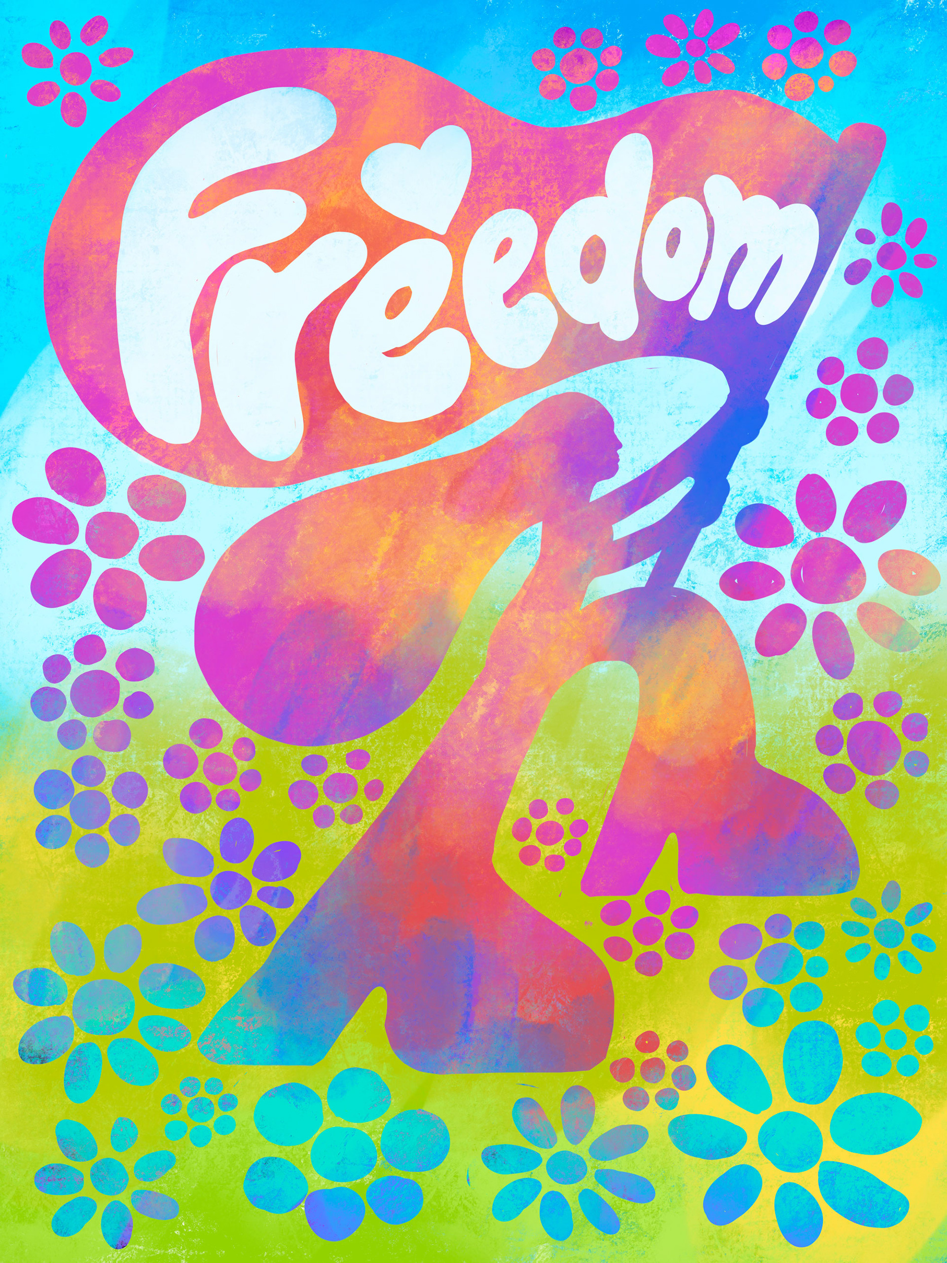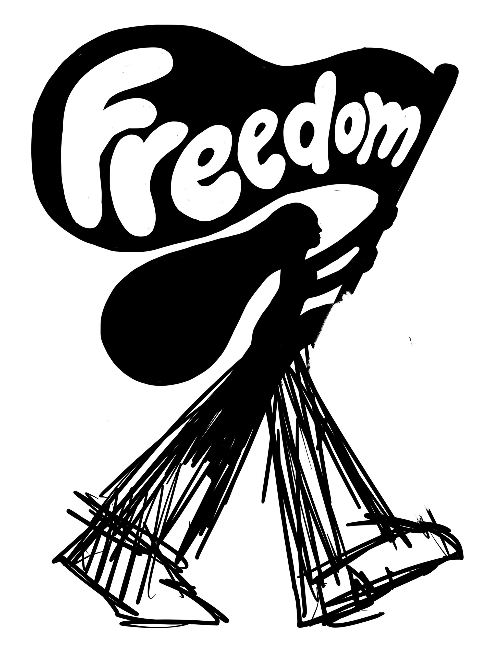 Bold illustration of women marching with flag with the word Freedom to promote Women's Civil rights.