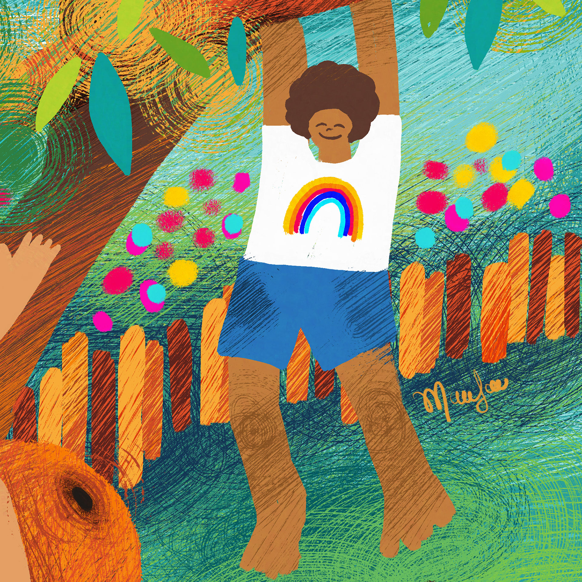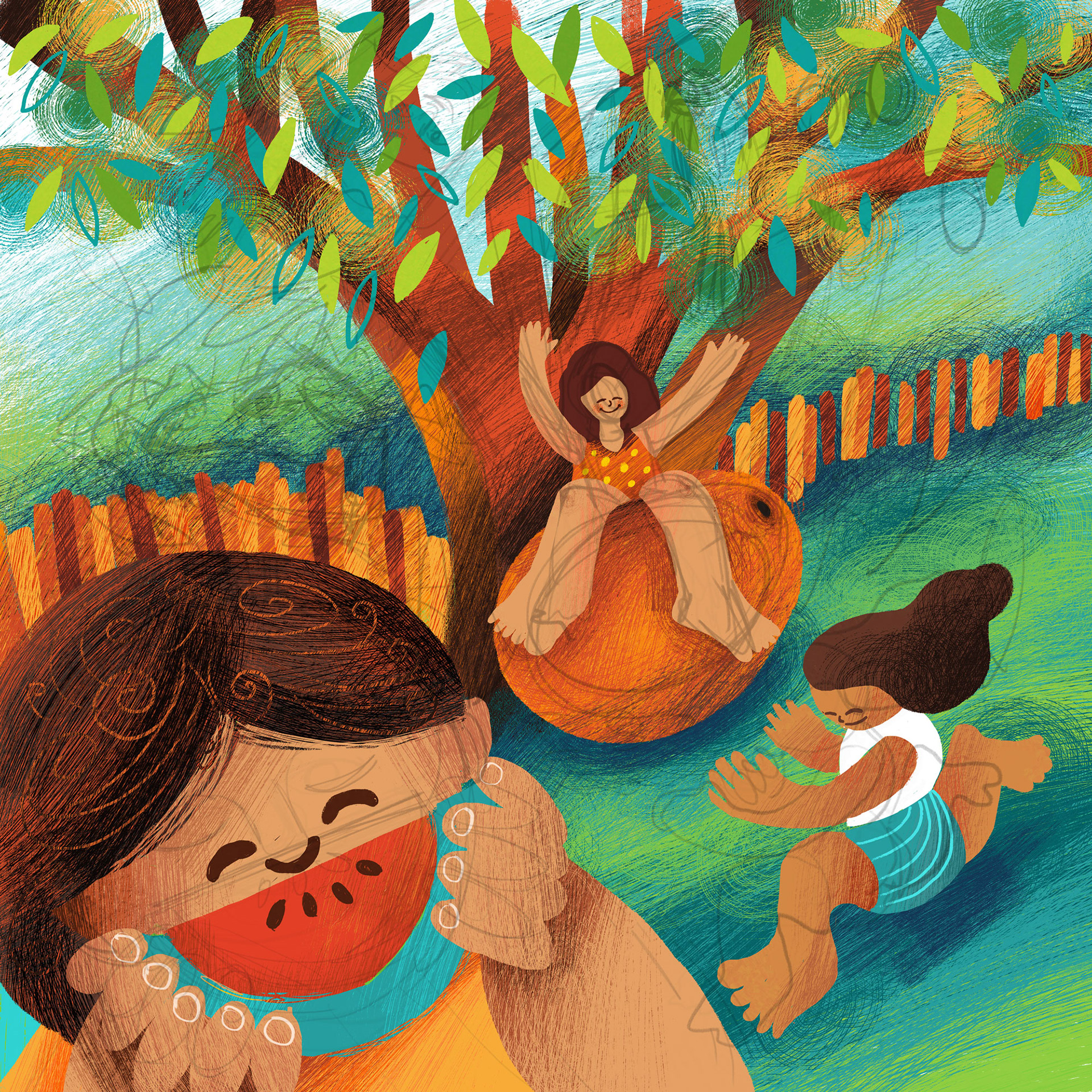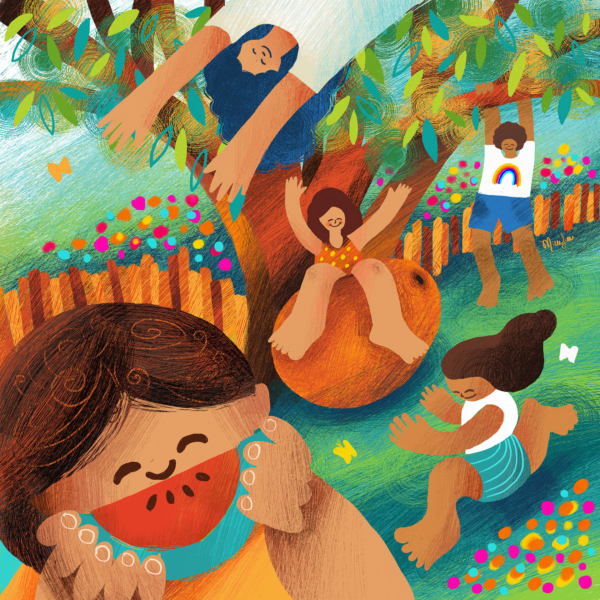 Illustration of a group of children in nature laughing, running, eating fruits and enjoying summer.