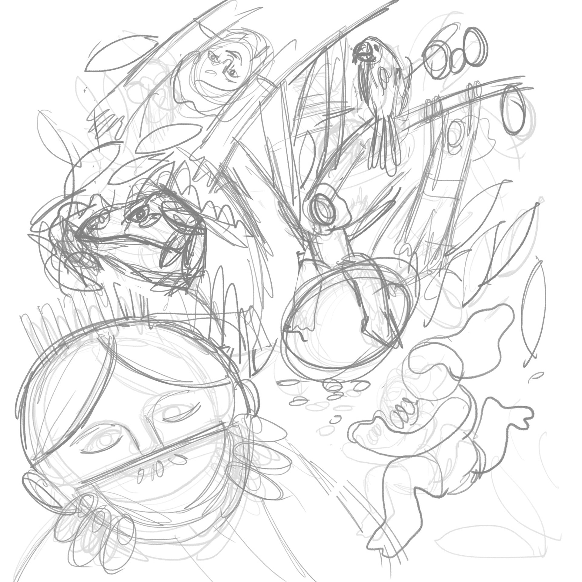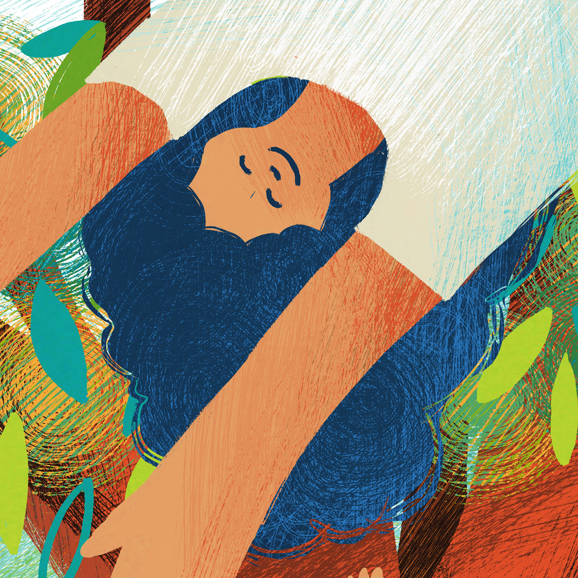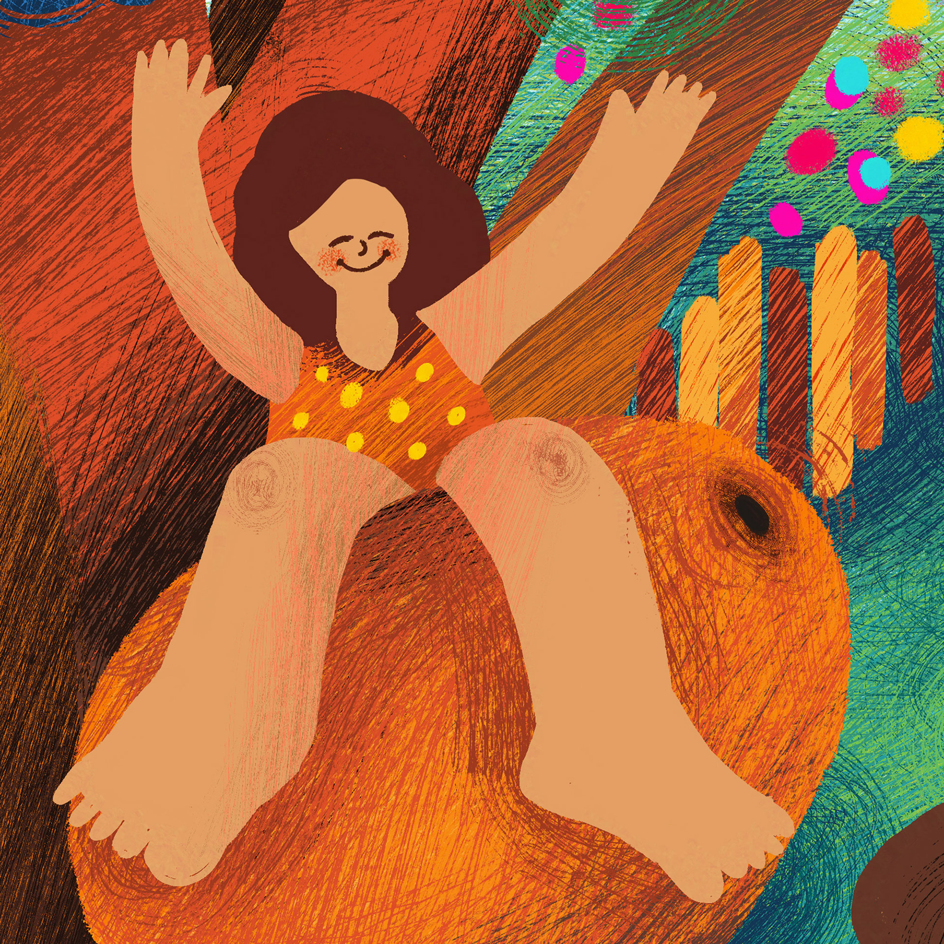 Illustration of a group of children in nature laughing, running, eating fruits and enjoying summer.