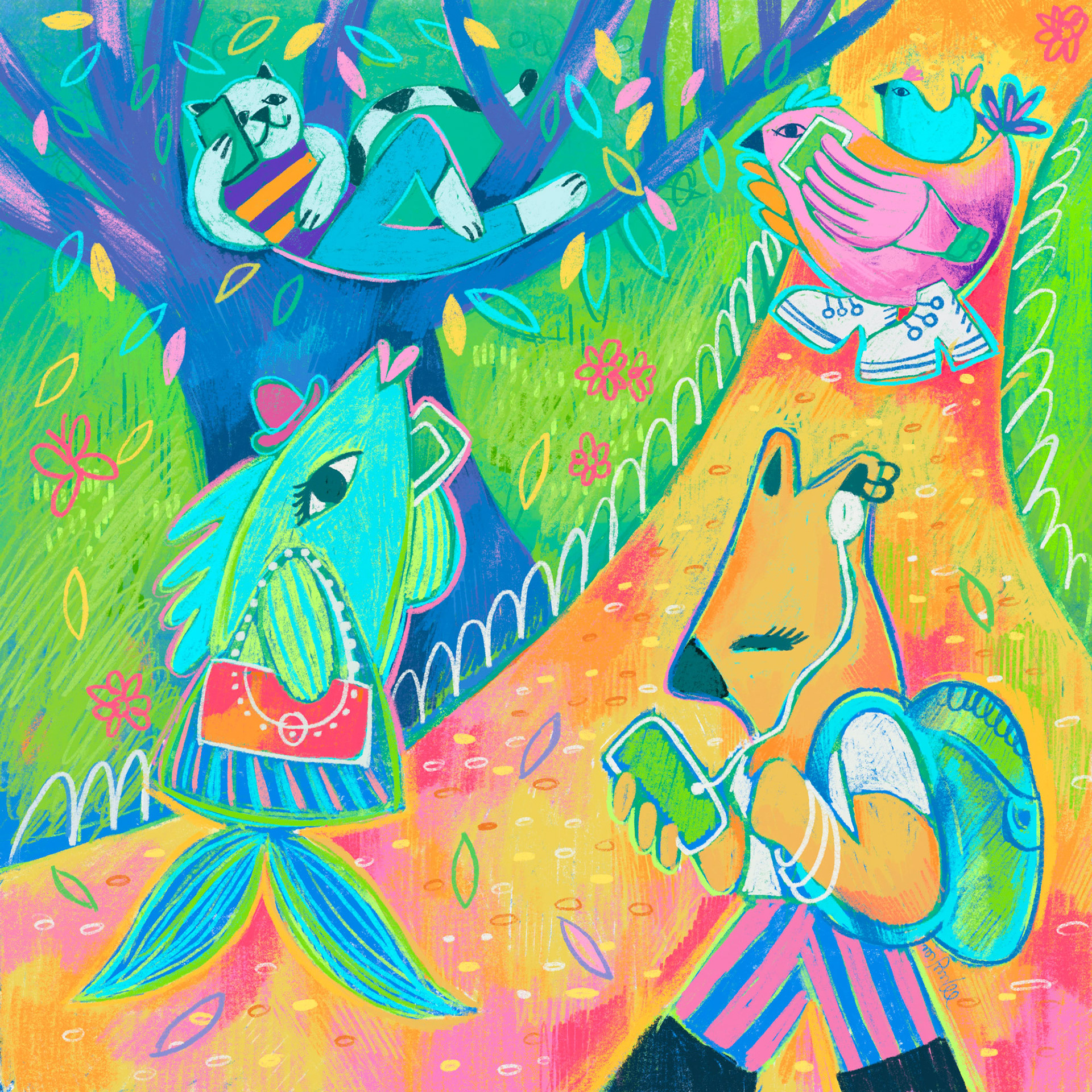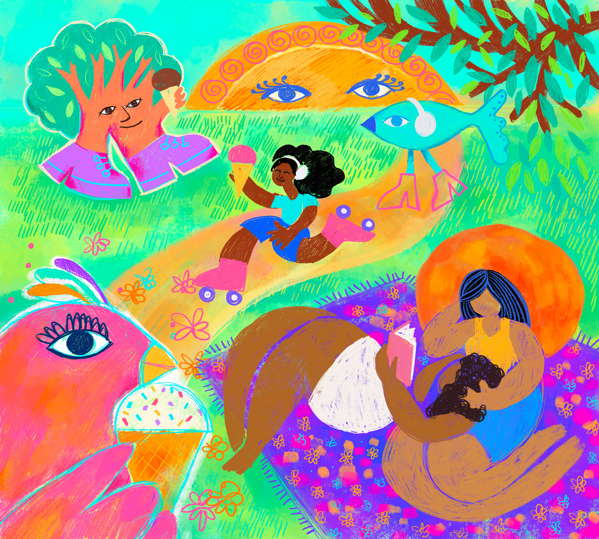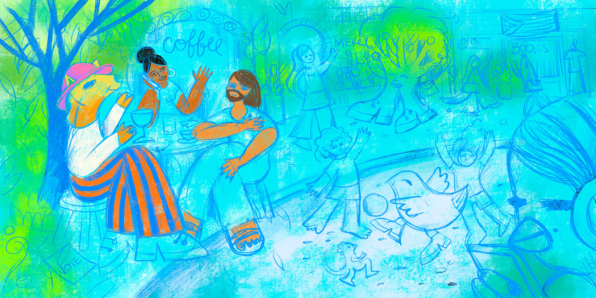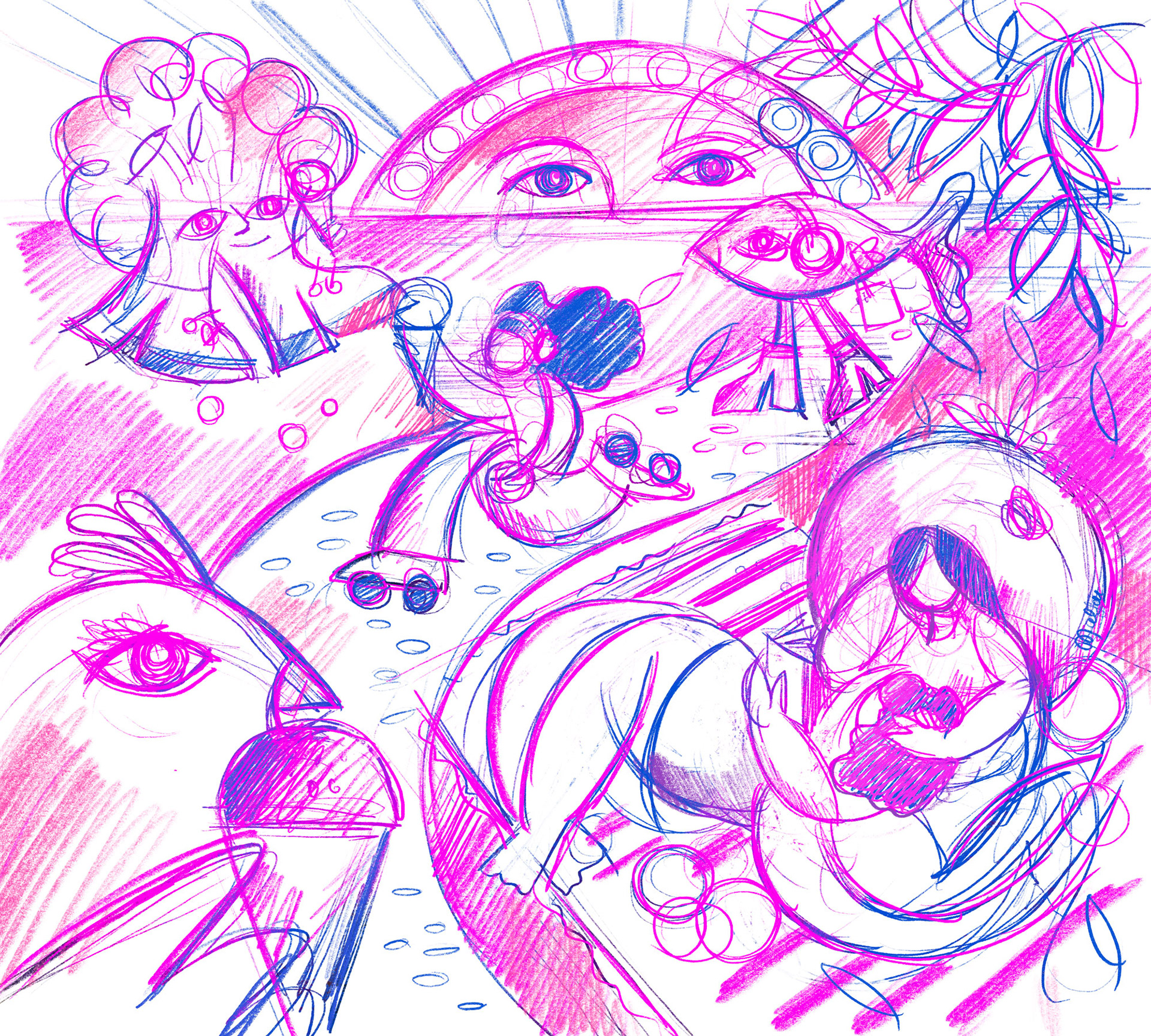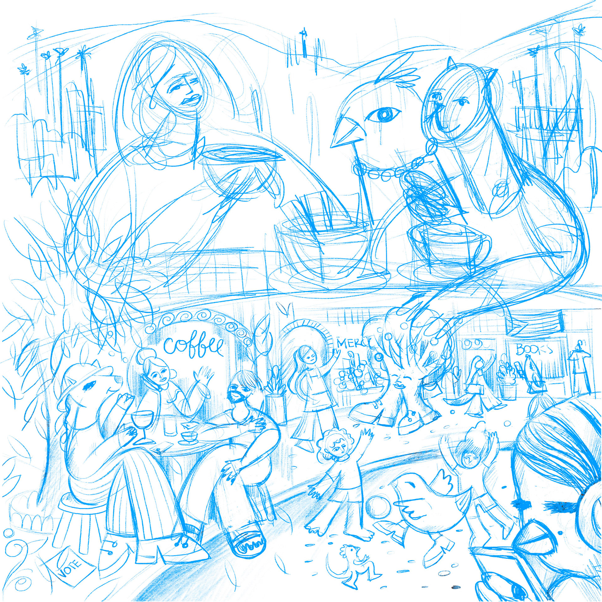 exploratory drawings and illustrations about modern life in the city during the summer